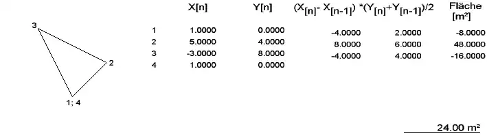 Die x und y Werte aller Punkte des zu berechnenden Polygons werden in einer Tabelle untereinander geschrieben. Dann wird die Gaußsche Trapezformel für jede Zeile angewandt, unter Einbeziehung der Zeile davor (für die erste Zeile wird hier die letzte Zeile verwendet).