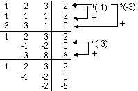 Zur zweiten Zeile wird also das -fache und zur dritten Zeile das -fache der ersten Zeile addiert. Damit null wird, wird im nächsten Schritt ein Vielfaches der neuen zweiten Zeile zur neuen dritten Zeile addiert, in diesem Fall das -fache: