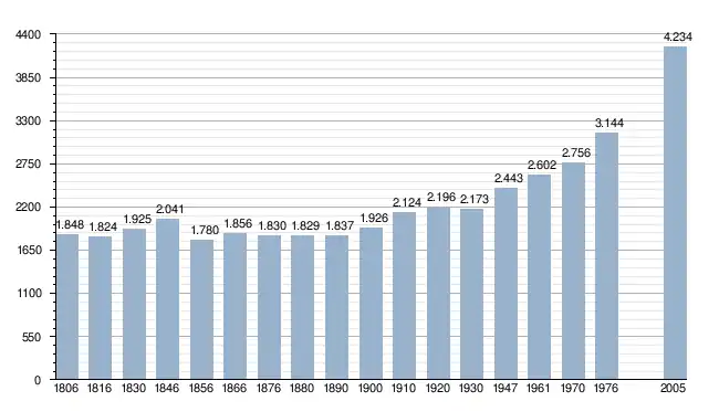- Bron: NIS; Opm:1806 t/m 1970=volkstellingen; 1976, 2005=inwoneraantal op 31 december