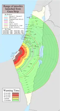 Allein im Jahr 2019 wurden aus dem Gazastreifen 1295 Raketen auf Israel abgefeuert. Von diesen wurden 478 vom Raketenabwehrsystem Iron Dome abgefangen.[66] Im Mai 2021 wurden erneut über 4.000 Raketen aus dem Gazastreifen auf Israel abgefeuert. Iron Dome konnte rund 90 % davon abfangen.[67] Auslöser für den Konflikt 2021 waren Einschränkungen der Ramadanfeiern durch israelische Sicherheitskräfte. Nach der Stürmung der Al-Aksa-Moschee durch die israelische Polizei begann am Montag, dem 10. Mai 2021 der Raketenbeschuss.[68][69] Nach dem Ende des elftägigen Konflikts lockerte Israel im Hinblick auf eine Stabilisierung der Region einige Einschränkungen; unter anderem wurden ab 2021 vermehrt Arbeitserlaubnisse für Israel erteilt,[70] häufig für Tätigkeiten im Baugewerbe, in der Landwirtschaft und in der Produktion.[71]