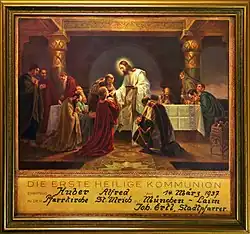 - Deckengemälde Jesus segnet die Kinder, Geburt Jesu und Abendmahl in der Pfarrkirche Hohenweiler/Vorarlberg 1908
