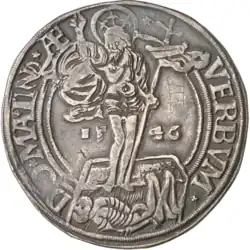 Ein Grenzfall besonderer Art sind die historisch und künstlerisch bedeutenden Locumtenenstaler. Das sind Gedenkmünzen (Guldengroschen) Friedrich des Weisen, die auch als Medaillen mit höherem Relief, aber ebenfalls im Talergewicht (Guldengroschengewicht) hergestellt und an Günstlinge verschenkt wurden. In Katalogen werden oft beide Typen als Guldengroschen (Gedenkmünzen) bezeichnet, obwohl nur die mit niedrigerem Relief Münzen sind.[8] Auch bei dem in Varianten geprägten Luftpumpentaler, dem ersten Gepräge mit Bezug auf Otto von Guericke, ist eine Variante davon keine Gedenkmünze, sondern eine Medaille.