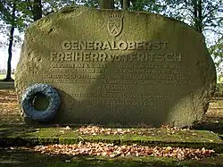 - ↑ Der Gedenkstein in Hoppenstedt hat die Inschrift: Generaloberst Freiherr von Fritsch, geboren am 4.8.1880, gefallen am 22.9.1939, Oberbefehlshaber des Heeres vom 1.2.1934 bis 4.2.1938. Dem deutschen Offizierskorps vorgelebt vom 27.1.1900 bis 22.9.1939. Dem deutschen Heer vorgestorben durch seinen Heldentod vor Warschau.
