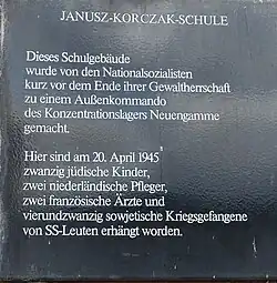 Am 20. April 1979 versammelten sich 2000 Menschen vor der Schule; Überlebende der Familien gründeten die Vereinigung Kinder vom Bullenhuser Damm[25], im Kellerraum wurden Schautafeln angebracht. Dem Journalisten Günther Schwarberg ist es durch seine Recherchen, seine Zeitschriftenartikel im Nachrichtenmagazin Stern im Jahr 1979 und sein Buch Der SS-Arzt und die Kinder vom Bullenhuser Damm gelungen, die Namen der Kinder vor dem Vergessen zu bewahren, die Täter anzuprangern und die Erinnerung an das Verbrechen mahnend wach zu halten. Schwarberg war lange Jahre Vorsitzender der Vereinigung Kinder vom Bullenhuser Damm.[26] 1980 wurde die Schule vom Hamburger Senat zur Gedenkstätte erklärt und nach Janusz Korczak benannt.