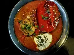 - Piperies Gemistes (griechisch πιπεριές γεμιστές) – Die griechische Variante wird mit Reis, Zwiebeln, Petersilie, Dill und Minze gefüllt.[7] Hackfleisch (kimas κιμάς) kann zugefügt werden.