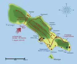 Am 7. August um 8 Uhr gingen das 1st Raider Battalion unter Oberstleutnant Merritt A. Edson und das 2nd Battalion, 5th Marines an der Westküste Tulagis, etwa in der Mitte der länglich geformten Insel an Land und stießen dabei auf keine Gegenwehr.[26] Da vor der Küste gelegene Korallenbänke die Landungsboote daran hinderten, bis auf den Strand zu fahren, mussten die Marines durch das seichte Wasser waten. Bei der Durchquerung dieser etwa 100 m breiten Wasserfläche wurden sie von den japanischen Besatzern Tulagis nicht gestört, die die Landung unvorbereitet traf. Etwa zu dieser Zeit schickten die japanischen Truppen, bestehend aus einer Einheit der 3. Kure Kaigun Tokubetsu Rikusentai und einigen Angehörigen der Yokohama Air Group unter dem Kommando von Kapitänleutnant Miyazaki Shigetoshi, eine Funknachricht an ihren Vorgesetzten, Kapitänleutnant Yamada Sadayoshi in Rabaul. In dieser Nachricht meldeten sie, dass sie angegriffen und daher ihre Ausrüstung und Unterlagen vernichten würden. Sie schlossen damit, dass der Feind mit überwältigender Stärke angriffe und sie daher ihre Positionen bis zum letzten Mann verteidigen würden. Hierfür befahl Suzuki Masaaki, Kommandeur des 3. Kure, seinen Soldaten, bereits früher eingerichtete Verteidigungspositionen zu besetzen.[27][23][28]