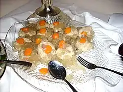 Das unter aschkenasischen Juden beliebteste am Schabbat kalt servierte Fischgericht war Fisch in Gelee, der im Osten vielfach süß, im Westen süß-sauer gegessen wurde.[14] Erst mit dem Aufkommen der Fertigprodukte in der zweiten Hälfte des 20. Jahrhunderts trat „Gefilte Fisch“ an seine Stelle als meistgegessener Schabbatfisch.[49]