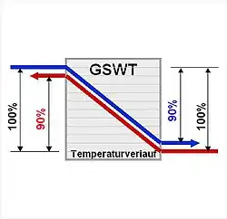 Die Effizienz kennzeichnet hier die Wirtschaftlichkeit des Wärmeübertragungsprozesses. Mit wenig Aufwand (Pumpen- und Ventilatorenergie) soll so viel wie möglich Nutzen (Wärmeleistung) erzielt werden. Eine Kennzahl der Effizienz ist das Verhältnis der Wärmeleistung zur Förderleistung von Pumpe und Ventilator. Bei Wärmeübertragungsprozessen wird diese Kennzahl zusätzlich auf einen Nutztemperaturhub von 1 °C bezogen. Bei dem GSWT liegt diese bezogene Effizienz bei gleichen Wärmekapazitätenströmen immer höher als 4:1. Soll beispielsweise die Lufttemperatur um 30 °C angehoben werden, ergibt sich eine Effizienz von 30*(4:1) = 120:1. Das heißt, für die Bereitstellung von 120 Teilen Wärmeleistung wird nur ein Teil Förderleistung benötigt.