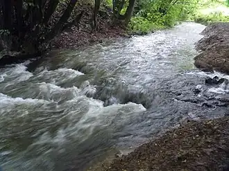 Der Geiersgrundbach mit Hochwasser, oberhalb von Hainchen im Jahr 2014 | ||