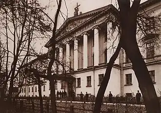Die Geistliche Akademie sieht sich als Nachfolger der Petrograder Akademie, die 1918 von den Bolschewisten geschlossen (nach Lublin/Polen verlegt)[1] und 1946 wiedereröffnet wurde. Diese geht zurück auf die Slawisch-Griechisch-Lateinische Schule, die 1725 im Alexander-Newski-Kloster gegründet und 1778 in das Hauptseminar umgestaltet und 1797 in Alexander-Newski-Akademie umbenannt wurde. 1908 wurde diese in drei Abteilungen gegliedert: die theologische Akademie (Universität), das theologische Seminar (College) und die theologische Schule (High School). Während der ganzen Zeit ihres Bestehens war es das Ziel der Akademie qualifizierte Kleriker heranzubilden sowie die Ausbildung stets zu verbessern. Aus diesem Bemühen heraus, wurde 1821 die Zeitschrift „Theologischen Schriften“ begründet. 1860 kam „Der Wanderer“ und 1875 der wöchentlich erscheinende „Kirchenbote“ hinzu.