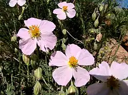 - Zweifarbiges Gewöhnliches Sonnenröschen (Helianthemum nummularium (L.) Mill. subsp. nummularium): Es ist weit verbreitet. Es gedeiht in Pflanzengesellschaften des Verbands Xerobromion, kommt aber auch in denen der Verbände Mesobromion, Violion oder Geranion sanguinei vor.[1] Die ökologischen Zeigerwerte nach Landolt et al. 2010 sind für diese Unterart in der Schweiz: Feuchtezahl F = 1+ (trocken), Lichtzahl L = 5 (sehr hell), Reaktionszahl R = 4 (neutral bis basisch), Temperaturzahl T = 4+ (warm-kollin), Nährstoffzahl N = 2 (nährstoffarm), Kontinentalitätszahl K = 4 (subkontinental).[7]