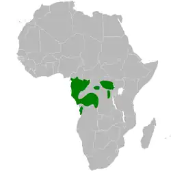 Der Vogel kommt vom Süden Kameruns bis Gabun, vom Norden Angolas bis zum äußersten Westen Ugandas vor.