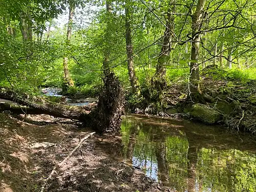 Bachbett der Gelpe - begleitet von Bäumen und Steinen