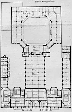 Seit 1844 bestand die private Sammlung von Pierre Louis Ravené mit einem bedeutenden Anteil an Bildern der Berliner- und Düsseldorfer Schule.[1] Das berühmteste Bild war von Adolph Menzel Friedrich der Große auf Reisen (1853/1854).[2] 1853 ließ Ravené vom Architekten Stüler Ausstellungsräume im neuen Geschäftshaus in der Wallstraße 92–93 ausbauen. Seitdem konnten die Kunstwerke in der ersten öffentlich zugänglichen Kunstsammlung Berlins besichtigt werden.[3] Der Enkel des Sammlungsgründers Louis Auguste Ravené ließ 1896 ein monumentales Geschäftshaus in der Wallstraße 5–8 errichten. Ab 1897 konnte man dort im 3. Obergeschoss in fünf Sälen und drei Kabinetten die Gemälde besichtigen. Ein Aufzug brachte die Besucher zum unentgeltlichen Ausstellungsbesuch.
