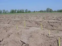 Sobald die Spargeltriebe im Frühjahr die Dammkrone durchbrechen, werden sie bis zu 25 cm ausgegraben und am unteren Ende zumeist mit einem speziell dafür gefertigten Stechmesser[26] abgeschnitten (gestochen). Dies geschieht bis heute in den meisten Fällen noch in Handarbeit. Nach dem „Stechen“ wird das entstandene Loch wieder aufgefüllt und die Oberfläche geglättet, um das Austreiben weiterer Triebe besser erkennen zu können.