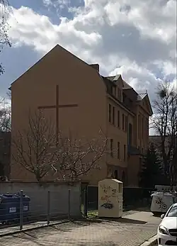 Das dreigeschossige Gemeindehaus entstand 1912/13 nach einem Entwurf des Maurermeisters Foerster und gehörte zur damals benachbarten Martinskirche. Die in schlichten Formen des späten Jugendstils gestaltete Fassade des Erdgeschosses ist verklinkert, die oberen Geschosse verputzt. Der Eingangsbereich ist als repräsentativer Portikus gestaltet. Der südliche Teil besteht aus einem flachen, von einem Dreiecksgiebel überspannten Seitenrisalit. Er ist durch kolossale Lisenen gegliedert und wird durch große Fenster geprägt. In diesem Gebäudeteil befindet sich ein Gemeindesaal, der seit der Zerstörung der Kirche für alle Gemeindezwecke genutzt wird. Bedeckt ist der Bau mit einem Mansarddach.