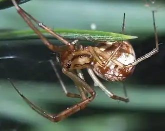 Das Netz wird meist niedrig über dem Boden, aber auch bis zu mehrere Meter hoch über dem Boden in Gräsern, Stauden und Sträuchern angelegt. Es besteht wie bei den meisten Vertretern der Familie aus einem nach unten gespannten horizontalen Netzteppich, über dem ein ca. 20 cm hohes Geflecht aus sehr lockeren „Stolperfäden“ angelegt ist. Die Spinne sitzt fast immer in Rückenlage an der Unterseite des Netzteppichs. Die Beute stößt meist gegen die Stolperfäden und fällt dann auf den Netzteppich, wo sie von der Spinne erbeutet wird.