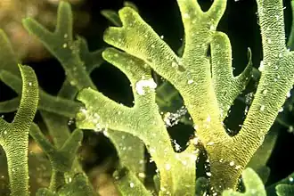 Die dichotome Verzweigung kommt zustande, indem sich die Scheitelzelle am Thallusende längs teilt. Der Thallus besteht aus einem inneren Gewebe aus großen Zellen zwischen zwei äußeren Rindenschichten aus kleinen Zellen.[3]