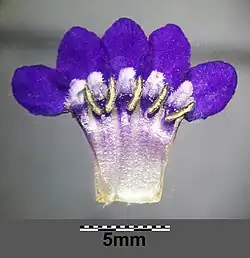 Der Farbwechsel der Blütenkrone von karminrot beim Aufblühen nach einfarbig dunkelviolett als Subtraktionsfarbe in Vollblüte erklärt sich dadurch, dass die Epidermis roten Zellsaft besitzt, das darunter liegende Mesophyll blauen.[6]