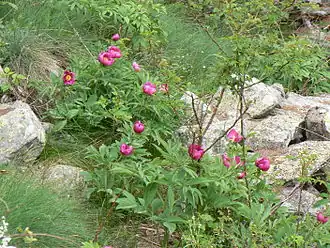 Gemeine Pfingstrose (Paeonia officinalis subsp. officinalis) am Naturstandort im Aostatal in Italien | ||||||||||||