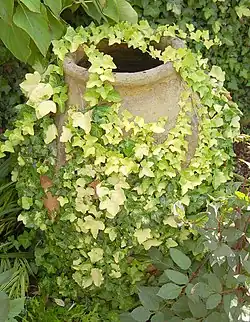 Dionysosverehrer glaubten, reichliches Efeuvorkommen an einem Ort sei ein sicheres Zeichen für die Anwesenheit des Gottes. Dichter bekränzte man mit Efeu, weil der Efeu auch eine heilige Pflanze des Gottes Apoll und der Musen war. In der Antike ist er deshalb bereits in den Gärten angebaut worden, obwohl Plinius der Ältere in seinen Schriften behauptete, dass diese Pflanze Mauerwerk (als Hedera muraria[62]) und Bäumen (als Hedera arborea) schadete und sich unter ihren Blättern Schlangen heimisch fühlten. Bereits in der Antike kannte man Sorten, deren Blätter weiß oder gelb panaschiert waren.