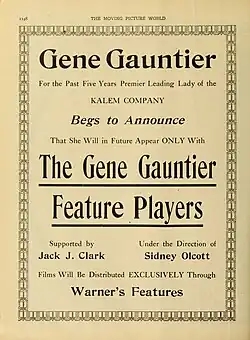 Im November 1912 und bei späteren Gelegenheiten reiste Gauntier mit ihrer eigenen Belegschaft ebenfalls nach Irland, Olcott war als Regisseur mit dabei. Für die Gene Gauntier Feature Players Company entstanden so zum Beispiel For Ireland's Sake im Jahr 1914. Mit derartigen Filmen, für die Gauntier meist das Drehbuch schrieb und eine Hauptrolle übernahm und Olcott als Regisseur fungierte, wurde das Unternehmen zu einem ernsthaften Konkurrenten der Kalem Company.[11][12]