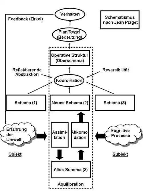 Schemata oder Strukturen sind in der genetischen Epistemologie geordnete Denk- und Verhaltensmuster, die als Handlungsregeln dazu dienen, „die Welt zu erfahren“.[7] Das neugeborene Kind verfügt über wenige, einfache Schemata wie den Saugreflex oder den Greifreflex. Im aktiven Umgang mit der Umwelt entwickelt es zunehmend komplexere und abstraktere Schemata. Diesem Prozess liegt ein Wechselspiel von Assimilation und Akkommodation zugrunde, das jeweils darauf ausgerichtet ist, ein Gleichgewicht (eine Äquilibration) in Form eines neuen Schemas herzustellen. Begegnet der Mensch etwas Neuem, versucht er diese Erfahrung zu assimilieren, indem er sie seinen vorhandenen Schemata zuordnet und diese hierdurch erweitert. Funktioniert die Einpassung nicht, versucht er seine Schemata der Erfahrung (dem Objekt) anzupassen und auf diese Weise ein Gleichgewicht herzustellen. Diese Akkommodation führt zur Veränderung oder Ausdifferenzierung bestehender Schemata. Ungleichgewichte und Akkommodation sind daher im Zusammenspiel ein Motor der Erkenntnisentwicklung.
