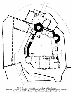 An der Stelle des heutigen barocken Wohngebäudes lag an der Nordseite der Anlage früher der Hauptwohnbau, der die gesamte Breite der Kernburg ausmachte. Ihm gegenüber lagen im Süden vermutlich Wirtschaftsgebäude.