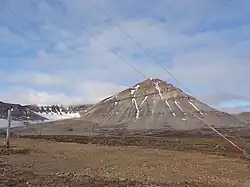 Im mittleren Tertiär ereignete sich im gesamten nordatlantischen Raum eine neue Phase des Vulkanismus, die auch Spitzbergen betraf. Lavaströme sind im Andrée-Land erhalten, wo die widerstandsfähige Basaltlava Berggipfel und Hochebenen bildet. Als die Vulkane ausbrachen, flossen diese Lavaströme entlang von Tälern und breiteten sich in Tiefland aus. Die spätere Erosion der hauptsächlich weniger widerstandsfähigen umgebenden Sandsteine führte zu einer Umkehrung des topografischen Reliefs, wobei die harten Basalte jetzt Berggipfel bilden.[3]