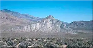 | mittleres und oberes Kambrium | Bonanza King Formation | hauptsächliche dicke Schichten von trockenem, massivem, dunklem Dolomit, dünne Kalkstein-Schicht (150 m dick) 300 m unterhalb der Spitze, zwei braune Schiefer-Schichten. Totale Dicke durch Verwerfungen unsicher, geschätzt 900 m in Paramint Range und 600 m in den Funeral Mountains | Die Schieferschicht in der Mitte enthält Linguid-Armfüßer und Überreste von Trilobiten (u. a. Ehmaniella). | |