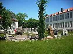 Im Hof werden Gesteine im Gewicht von insgesamt 300 Tonnen aus allen Teilen Deutschlands ausgestellt, darunter 40 Findlinge im Gewicht von bis zu 30 Tonnen. Die Exponate repräsentieren Magmatite, Sedimentgesteine und Metamorphite aus den Erdzeitaltern zwischen Präkambrium und Quartär. Ihre Anordnung lehnt sich an die Spirale eines Ammoniten (Holcophylloceras) und die Form eines Keilblattgewächses (Sphenophyllum) an.