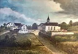 Dargestellt sind die drei Dorfkerne Ober- und Unterdorf und Rain sowie die umliegenden Weiler wie Horn, Erdbrust, Am Bach, Haumesser, Mutschellen oder Asp. Eingezeichnet sind Gebäude, Wiesen, Felder und Rebberge.