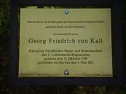 1913 wurde die Grabstelle von Major von Kall neu vorgerichtet und ihm zu Ehren mit einer Grabplatte abgedeckt. Die Inschrift lautet: