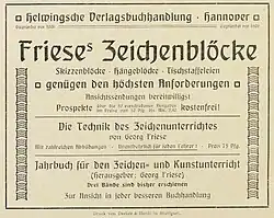 Zum 1. September 1910 lobten Friese und die Helwingsche Verlagsbuchhandlung einen Wettbewerb aus „zur Erlangung künstlerischer Umschlagzeichnungen Frieses Zeichenblock für ihren in 50 Ausgaben erscheinenden ‚Frieses Zeichenblock‘“; die ersten vier Preise beinhalteten 400, 300 und 100 Mark.[23]