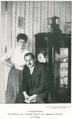 Georg Hermann war im ersten Drittel des 20. Jahrhunderts ein vielgelesener Schriftsteller. Sein literarisches Vorbild war Theodor Fontane, was ihm auch die Bezeichnung „jüdischer Fontane“ eintrug.[3] Die Romane Jettchen Gebert und Henriette Jacoby, die im Berlin der Jahre 1839/40 spielen und ein Bild des liberalen Geistes dieser Zeit in einer jüdischen Familie zeichnen, waren seinerzeit Bestseller und konnten zusammen mehr als 260 Auflagen aufweisen. Die Titelfigur von Jettchen Gebert war inspiriert von Betty Isolani-Perl, der Mutter von Gertrud Isolani.[4] Hermanns andere Romane erreichten nicht die gleiche Popularität.