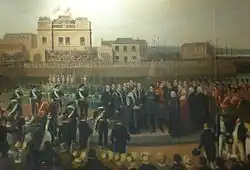Walter Scott war maßgeblich an der Organisation des 21 Tage währenden Besuches in Schottland beteiligt und nutzte die Gelegenheit, um bei mehreren der aufwendigen Feiern schottische Traditionen und Lebensart zu präsentieren. Georg IV. revanchierte sich, indem er mehrmals in einem Kilt erschien und damit dazu beitrug, dieses traditionelle Gewand der Highlands so populär zu machen, dass es sich während des 19. Jahrhunderts zur nationalen Tracht von ganz Schottland entwickelte und auch in den eher englisch geprägten Lowlands getragen wurde.[85][86] In Edinburgh gab der König einen Empfang im Holyrood Palace und ordnete dessen Sanierung an, die sich über die nächsten zehn Jahre erstreckte, wobei die Räume von Maria Stuart unverändert blieben.