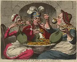 Das anschließende Krönungsbankett in der Westminster Hall fand für 1.268 Personen an 47 Tafeln statt, wobei noch Galerien für zusätzliche 2.934 Zuschauer errichtet wurden.[80] Der romantische Zeitgeschmack veranlasste den König, den Gästen Kostüme im Stil der Tudor- und Stuartzeit vorzuschreiben. Von den Kronleuchtern tropfte das Wachs der 3.000 Kerzen auf die Gäste. Nachdem der König um 20.20 Uhr ins Carlton House zurückgekehrt war, durfen die Zuschauer von den Galerien ebenfalls an die Buffets; dabei kam es teilweise zu Tumulten, Soldaten verhinderten knapp die Stürmung der Küchen, Porzellan und Silberplatten wurden gestohlen und Lord Gwydyr gelang es mit Mühe, das kostbare goldene Krönungsservice vom Tisch des Monarchen zu retten. Um 3 Uhr morgens wurden die letzten betrunkenen Gäste unter den Tischen hervorgezogen.[81] Bei den gleichzeitigen Volksfesten in der Stadt schlug ein die Königin feiernder Mob im West End Fensterscheiben ein und musste von der Household Cavalry zerstreut werden.[82] Georgs Bruder und Nachfolger Wilhelm IV. brach später mit der Tradition der Krönungsbankette, die auf die Krönung von Richard Löwenherz im Jahr 1194 zurückgeht, weil er diese als zu teuer und aufwendig empfand. Das Krönungsbankett Georgs IV. ist bislang das letzte, das in Großbritannien stattfand.