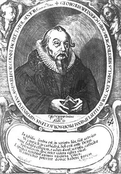 - ↑ vgl. auch: Vincentius Schmuck: Christliche Leichpredigt Uber die Historiam vom Tode Aaronis, Num. 20.: Bey Volckreicher ansehnlicher Leichbestattung/ des weiland Ehrwürdigen, Großachtbarn und Hochgelarten Herrn/ Georgii Weinrichs/ der H. Schrifft Doctorn und Professorn, Pfarrern zu S. Thomas und Superintendenten in Leipzig auch des Churf. Sächsischen Consistorii daselbst Assessorn, der Theologischenfacultät, ingleichen der Polnischen und Schlesischen Nation Seniorn, Domherr zu Meissen, und Collegiaten des Collegii B. Virginis zu Leipzig etc. Welcher den 27. Ianuarii des 1617. Jars in Gott selig verschieden/ unnd den 31. desselben Monats Christlicher weise in der Kirche zu S. Thomas daselbst zur Erden bestattet worden. Leipzig 1617 (Online)