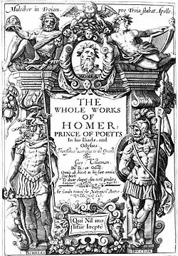Ab 1598 veröffentlichte er seine Übersetzung der Ilias, 1616 erschien die vollständige Ausgabe Ilias and Odyssee in der ersten vollständigen englischen Übersetzung, The Whole Works of Homer. Chapmans Homer ist von John Keats in seinem berühmten Gedicht On First Looking into Chapman's Homer hervorgehoben worden.[5] Chapman sah die homerischen Epen als geheimnisvolle symbolische Dichtung, die seinem eigenen Ideal einer elitären Dichtung entsprach, und brachte in seine Übertragungen seinen eigenen Stoizismus ein.