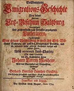 - Gerhard Gottlieb Günther Göcking: Vollkommene Emigrations-Geschichte von denen aus dem Ertz-Bißthum Saltzburg vertriebenen und größtentheils nach Preussen gegangenen Lutheranern, in sich haltend eine genaue Beschreibung so wohl des Ertz-Bißthums Saltzburg als auch des Königreiches Preussen und die besonders hieher gehörige Geschichte voriger und jetziger Zeiten. Nebst accuraten Land-Charten. Mit einer Vorrede von Sr. Hochwürden Herrn Johann Lorentz Mosheim, Abts von Marienthal und Michaelstein. Mit Königl. Preussisch- und Chur-Fürstl. Brandenburgischen allergnädigesten Privilegio. [1. Teil]. Verlag Christian Ulrich Wagner, Frankfurt / Leipzig 1734. Digitalisat