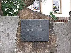 Der große Syenit-Stein steht in einer Mauernische einer Grundstücksmauer, auf ihm ist eine schwarze Steinplatte befestigt, die eingraviert den Namen „Gerhart Hauptmann“ trägt.