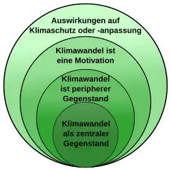Weiter ordnen Peel und Osofsky Klagen vier Sphären zu: Im Kern sind Verfahren, in denen Aspekte des Klimawandels eine zentrale Rolle spielen, weiter außen spielen sie eine periphere Rolle. Zur dritten Sphäre gehören Fälle, die unter anderem vom Klimawandel motiviert sind, ohne ihn ausdrücklich als Streitgegenstand einzubeziehen. Eine vierte Gruppe bilden Klagen, bei denen Klimaschutz und -anpassung weder Streitgegenstand noch Motiv sind, aber vom Ergebnis der Klage berührt werden.[6]