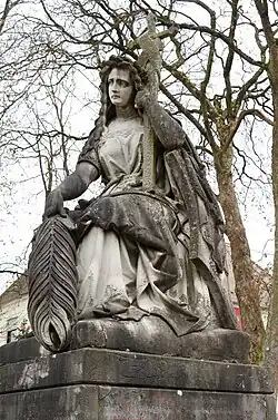 Als Standort stellte die Witwe Mathilde Panizza, Mutter des Schriftstellers Oskar Panizza sowie Eigentümerin des Russischen Hofes (heute: Kurhausstraße 9), ihren südlich des Bad Kissinger Kapellenfriedhofes gelegenen Acker zur Verfügung.[2][3] Mit der Ausführung des Denkmals wurde der Bildhauer Michael Arnold beauftragt, der für die Errichtung der Germania ein Honorar von 3.000 Gulden erhielt.[2] Die Konzeption des Denkmals drückte das Empfinden der gegen den Deutschen Krieg eingestellten deutschen Bevölkerung aus, dass nicht nur Bayern, sondern ganz Deutschland den Krieg verloren habe.[4] Dies wird in der Skulptur dadurch deutlich, dass der Adler des Reichswappens, auf dem sich die Germania abstützt, zu zwei Dritteln durch deren Mantel verdeckt ist; lediglich die Adlerfänge mit Reichsapfel und Zepter sind zu sehen.[4][5]