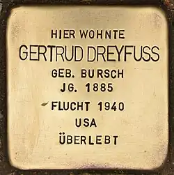 Alfred Dreyfuss wurde im März 1933 unter dem Vorwurf, mit SPD-Leuten zu sympathisieren, verhaftet. Er kam nach drei Monaten im Zellengefängnis Lehrter Straße wieder frei.[2] Die Söhne Fritz und Ernst emigrierten rechtzeitig nach England und im Sommer 1938 in die USA. Hans konnten die Eltern mit einem Kindertransport nach England schicken. Unmittelbar nach der Pogromnacht 1938 begannen Alfred und Gertrud Dreyfuss mit Fluchtvorbereitungen. 1940 gelang es ihnen, über die Sowjetunion und Japan in die USA auszureisen. Dort verstarb Alfred Dreyfuss kurz nach seiner Ankunft infolge der Strapazen der Flucht. Gertrud Dreyfuss heiratete noch einmal und nahm den Namen Gertrude Handsman an. Sie arbeitete auch in den USA als freischaffende Malerin. Ihre Bilder befinden sich weitgehend im Besitz von Familienangehörigen in den USA und in Großbritannien.