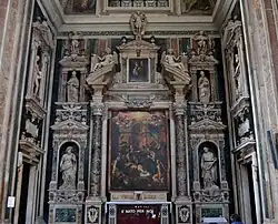 Eine Tür rechts vom Altar führt zur Sakristei, mit Mobiliar des 17. Jahrhunderts, einem Altar und Waschbecken von Dionisio Lazzari und einer barocken Dekoration aus vergoldetem Stuck auf weißem Grund an den Wänden und im Gewölbe, in deren Mitte sich ein Gemälde Der heilige Michael, der die rebellischen Engel vertreibt (1652) von Aniello Falcone befindet.[7]