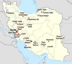 Bereits in der Jungsteinzeit (Neolithikum) wurde das Land, das heute als Iran bezeichnet wird, besiedelt, bzw. es sind Siedlungsspuren nachweisbar. Dauersiedlungen und Nahrungsmittelerzeugung sind etwa durch bemalte Keramik und kleine Tonfiguren für das jüngere Neolithikum (6500–5550 v. Chr.) nachweisbar.[1] In der ehemaligen Provinz Chusistan liegen die kraft kalibrierter 14C-Datierungen auf eine Besiedlungsgeschichte ab dem 8. Jahrtausend v. Chr. reichenden Tschogha Bonut sowie Tschogha Misch. Im 4. Jahrtausend v. Chr. gab es eine erste Wanderbewegung von Indogermanen, die zusammen mit den Indern die Bezeichnung Arier (ariyānām) haben. Die Herkunft dieser Arier ist umstritten, man ist sich aber darüber einig, dass sie aus dem Norden stammen. Bereits gegen Ende des 4. Jahrtausend v. Chr. kann von einer städtischen Zivilisation gesprochen werden, die sich aus der Ackerbau betreibenden, sesshaften Bevölkerung entwickelte.[2]