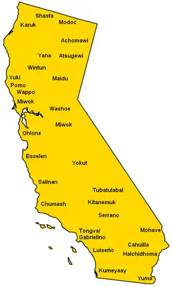 Die etwa 30 Stämme auf dem Gebiet Kaliforniens werden in sechs Sprachgruppen eingeteilt, was eine hohe kulturelle Diversität bedeutet. Diese war vermutlich das Ergebnis verschiedener Migrationszüge.[3][4] Beim ersten Eintreffen von Europäern in Kalifornien trafen sie auf Indianerstämme der Chumash, Maidu, Miwok, Modoc, Mohave, Ohlone, Pomo, Shasta, Tongva und Wintu.