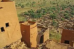 Ganz anders als die Großreiche entwickelte sich die Kultur der Dogon. Folgt man der mündlichen Tradition, so entstand deren Kultur auf den bis zu 500 m hohen und 150 km langen Bandiagara-Klippen, welche 1989 zum Weltkulturerbe erklärt wurden, zwischen dem 8. und dem 15. Jahrhundert. Nach Christopher D. Roy lebten die Dogon noch bis 1480 im Nordwesten von Burkina Faso.[50] Ihre Kultur wurde von den Mandinka, verschiedener Gruppen der Gur-Sprachen und Songhai getragen, litt aber immer wieder unter Raubzügen der Fulbe, Bambara und Mossi. Dies hing damit zusammen, dass sie nach islamischen Grundsätzen als Nichtgläubige versklavt werden durften. Heute leben mehr als 400.000 von ihnen in den cercles Koro, Bankass, Bandiagara und Douentza.[51] Ein Teil von ihnen ist zum Islam konvertiert.