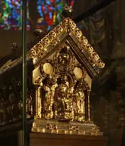 Das durch natürliche Thermalquellen begünstigte Aachen, heute die westlichste Großstadt Nordrhein-Westfalens und Deutschlands, konnte unter Karl dem Großen durch den Bau einer Königspfalz von einer Siedlung mit römischen Ursprüngen zur wichtigsten Residenzstadt des Frankenreichs und zum Zentrum der Karolingischen Renaissance aufsteigen. Die Pfalzkapelle Aachens, eine Nachahmung des spätantiken Zentralbaus San Vitale in Ravenna, soll im Winter 804/805 durch Papst Leo III. höchstselbst eingeweiht worden sein.[8]