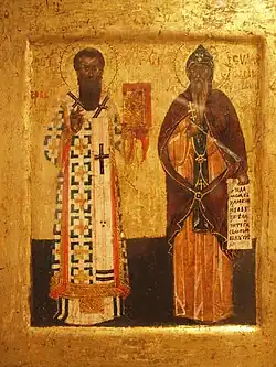 Ikone mit den kanonisierten Mitgliedern der Nemanjiden, Sava von Serbien und Stefan Nemanja. Alle Nemanjiden-Herrscher mit Ausnahme von Zar Uroš V. Dušan wurden bald von der Orthodoxen Kirche kanonisiert, was durch deren weitreichende Protektion der Autokephalen Kirchenentwicklung sowie den Zuwendungen an Kloster und deren räumlich ausgreifenden Stiftungstätigkeit begründet war. Ikone Anfang 14. Jh., Nationalmuseum Belgrad